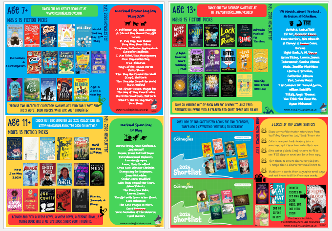 Each month I produce a free Fiction Newsletter or Booklist aimed at schools, libraries, young people and parents. These resources, like all my resources, make colourful displays and can be sent digitally to parents as part of your R4P initiative. You can use them as you wish but please ensure that they remain as found on the website. thank you and enjoy.